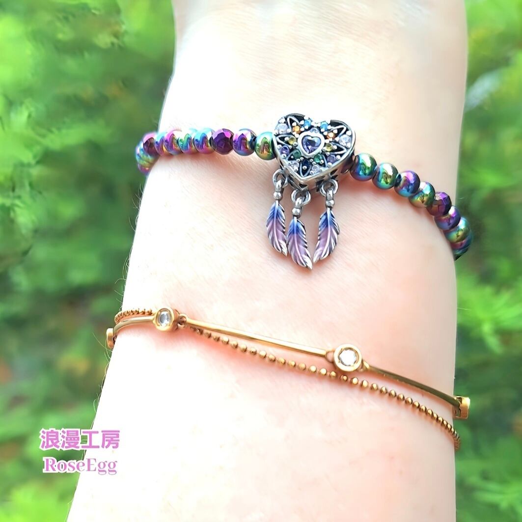 ドリームキャッチャー シルバー シルバーアクセサリー シルバー925 ヘマタイト カラーヘマタイト レインボー レインボーカラー 虹色 虹 紫陽花 あじさい 紫陽花色 玉虫色 キラキラ 幸運 ラッキー アイテム 爽やか 夏 先取り サマー 梅雨 お洒落 ブレスレット アクセサリー チャーム 天然石 天然石ブレスレット 天然石アクセサリー 開運 ハート ハート型 ハート形 羽 羽根 ピンク ピンクの羽 紫 パープル キラキラ 厄除け 魔除け 邪気 邪気祓い 邪気払い 悪夢 吉夢 良い夢 夢 ドリーム 安眠 勝利 幸運のお守り お守り 御守り お守りブレスレット 教室サロン 寒河江博子 RoseEgg roseegg 浪漫工房RoseEgg 浪漫工房roseegg