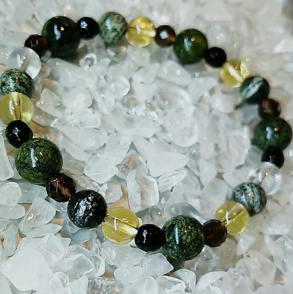 蛇の柄に見える事からこの石の名前が付きました 深みのある緑が艷めき見ているだけで勇気が湧いて来ると言われます。